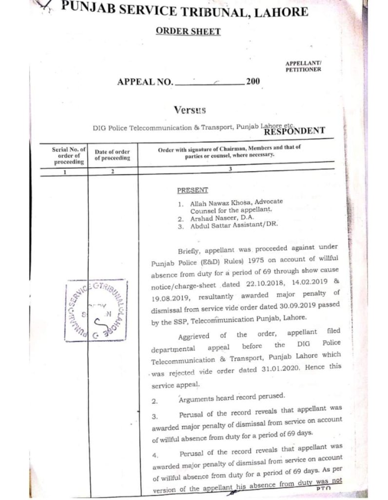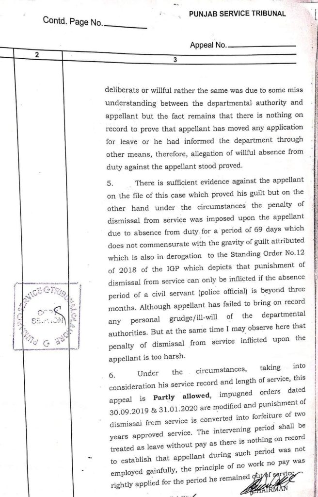 6. Under the circumstances, taking into consideration his service record and length of service, this appeal is Partly allowed, impugned orders dated 30.09.2019 & 31.01.2020 are modified and punishment of dismissal from service is converted into forfeiture of two years approved service. The intervening period shall be treated as leave without pay as there is nothing on record to establish that appellant during such period was not employed gainfully, the principle of no work no pay was rightly applied for the period he remained out of service.